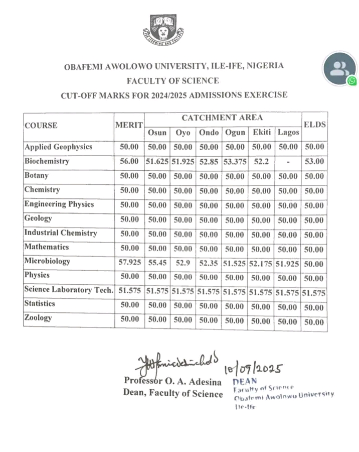 📍 Faculty of Science, OAU, Releases 2025 Cut-Off Marks
